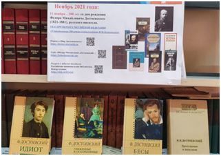 В конкурс чтецов «Золотая осень» приняли участие почти все дети. Все участники готовились серьезно, блестяще выступили, показав свое мастерство и оригинальность исполнения. Были определены победители. Все награждены грамотами. Учителями старательно подбирался литературный репертуар, велась работа с детьми над выразительностью и эмоциональностью их исполнения. Звучали прекрасные стихи русских поэтов.Экскурсию по книжной выставке: «Как важно вовремя успеть сказать кому-то слово доброе» (К 200-летию Ф.Достоевского) провели учащиеся 8-б класса, учитель Татаревская С.Б.